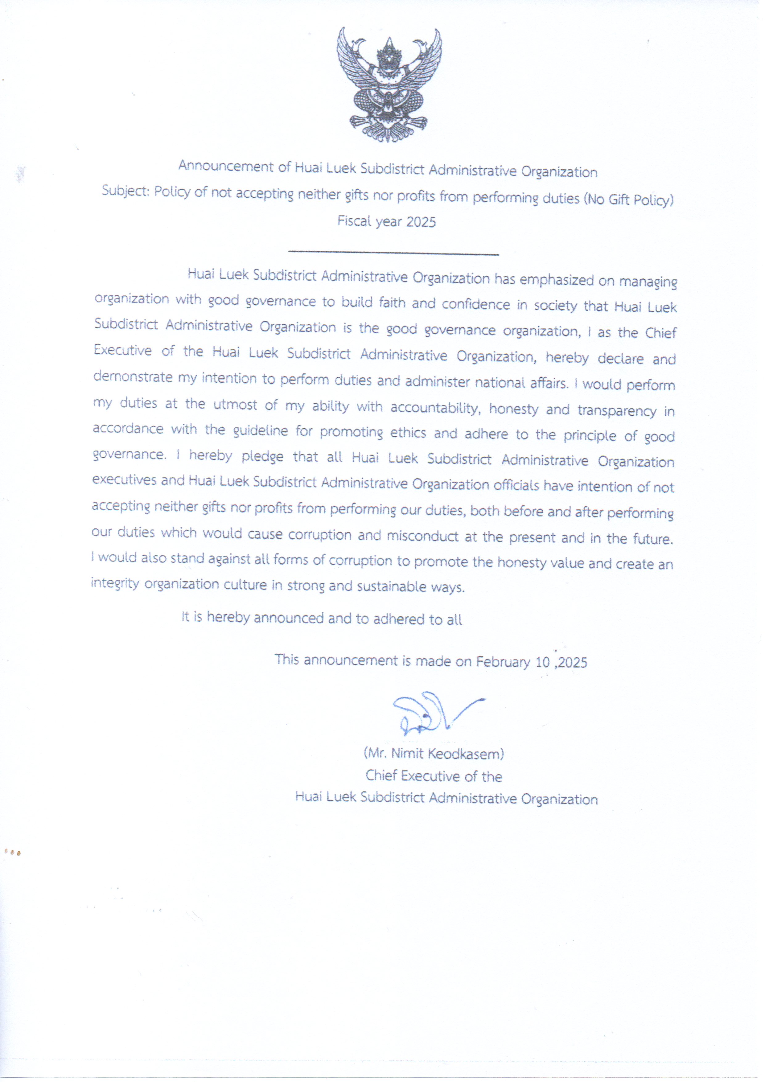 ประกาศ อบต.เรื่อง นโยบายการไม่รับของขวัญและของกำนัลทุกชนิดจากการปฏิบัติหน้าที่ (No Gift Policy) ขององค์การบริหารส่วนตำบลห้วยลึก ประจำปีงบประมาณ พ.ศ.2568