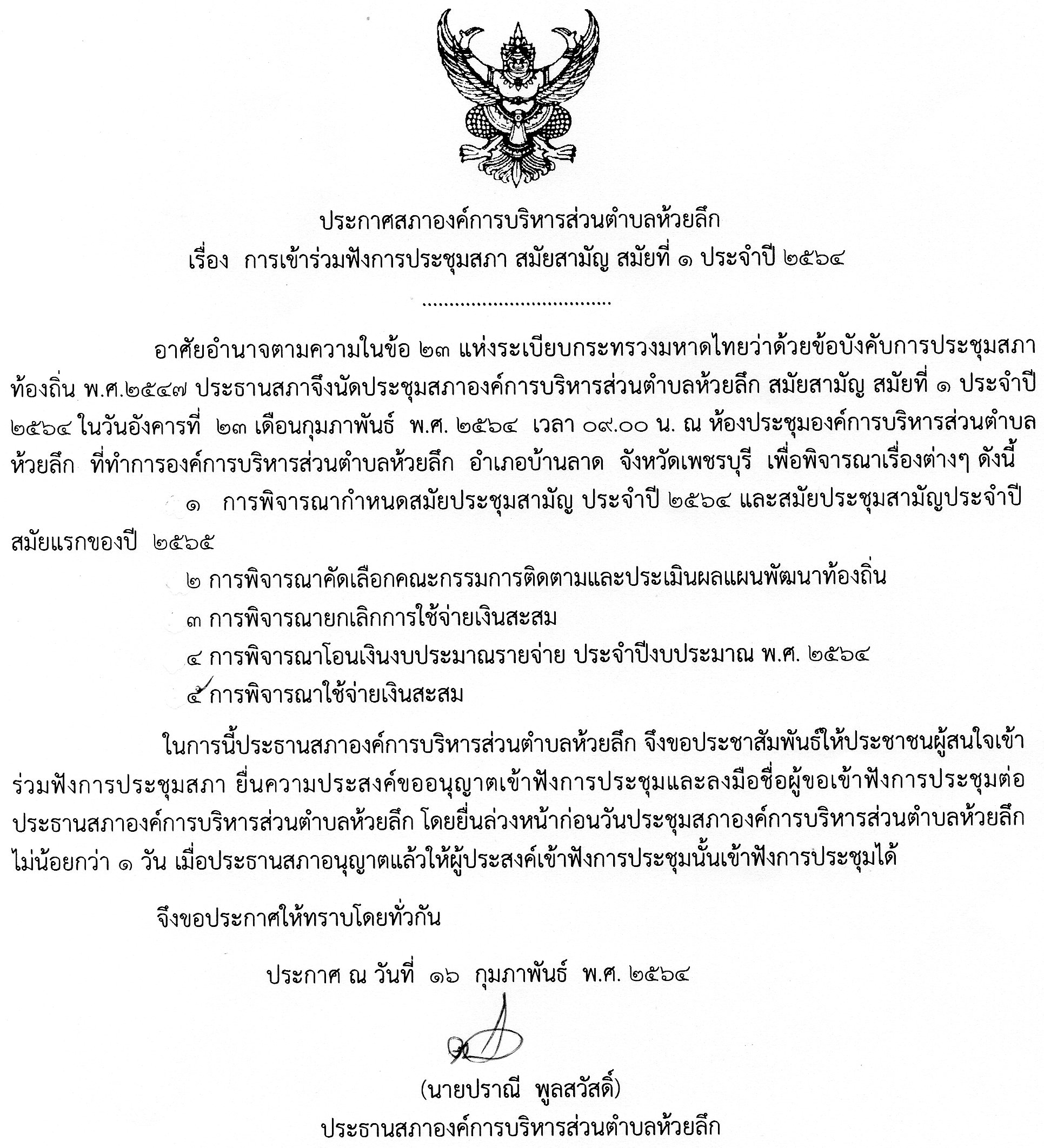 ประกาศสภาองค์การบริหารส่วนตำบลห้วยลึก
